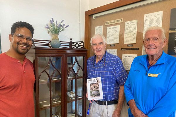 Tony Westby-Nunn (centre) and Rhodes Cottage Museum volunteers Ryan Green left) and Tony Rozemeyer at the wooden cabinet in the bedroom from which valuable coins and badges disappeared a few years ago. Image: the author.