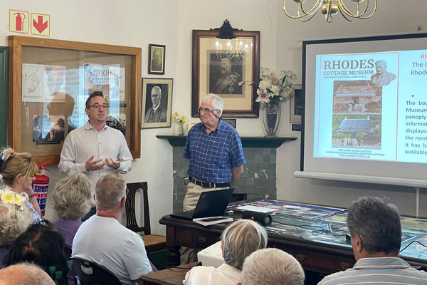 The chairman of the Muizenberg Historical Conservation Society, Brett McDougall (left), introduces author Tony Westby-Nunn at the book launch.
